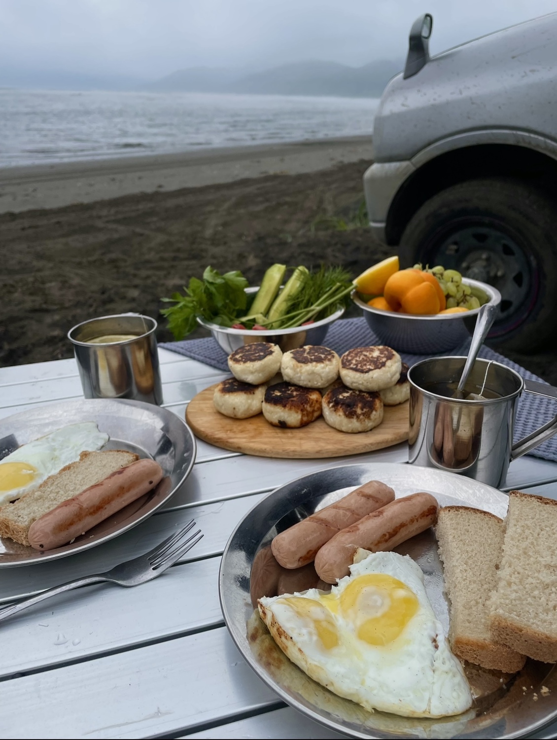 Внутри автомобиля найдётся всё самое необходимое: газовая горелка, набор посуды, термос, кемпинговая складная мебель.